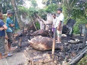 শুক্রবার (১৪ আগস্ট) দিবাগত মধ্যরাতে ইউপির মুদৎ গ্রামের কৃষক মো. ফারুক আহমদের বাড়িতে এই ঘটনা ঘটে। এসময় আগুনে কৃষকের তিনটি গরু ও ৫৫টি হাঁস-মোরগ পুড়ে মারা যায়। খবর পেয়ে শনিবার থানা পুলিশ ও ফায়ার সার্ভিসের লোকজন ঘটনাস্থল পরিদর্শন করেছে।