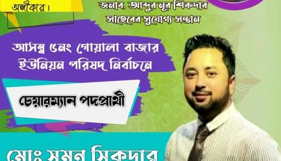 ।আসন্ন ওসমানী নগর উপজেলার গোয়ালা বাজার ইউনিয়ন পরিষদ নির্বাচনে প্রার্থীতা সম্পর্কে সুমন শিকদার গোয়ালা বাজার ইউনিয়ন পরিষদে নৌকার কান্ডারী হতে চান উল্লেখ করে বলেন, দল যদি আমাকে মুল্যায়ন করে দলীয়ভাবে মনোনয়ন প্রদান করে তবে আমি নির্বাচন করবো। এক্ষেত্রে সবার সহযোগিতা প্রয়োজন।