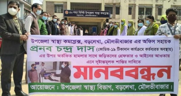 বড়লেখা প্রতিনিধি : বড়লেখা উপজেলা স্বাস্থ্য কমপ্লেক্সে এ কোভিট ১৯ টিকাদান কার্যক্রমে কর্তব্যরত অবস্থায় অফিস সহকারি প্রণব চন্দ্র দাসের উপর অর্তকিত হামলার সাথে জড়িতদের দ্রুত গ্রেফতার ও আইনের আওতায় এনে দৃষ্টান্তমূলক শাস্তির দাবিতে মানববন্ধন ও প্রতিবাদ সমাবেশ করেছে উপজেলা স্বাস্থ্য বিভাগ বড়লেখা।মামলা দায়েরের একদিন পরও কোন আসামি গ্রেফতার না হওয়ায় ভুক্তভোগিরা হতাশ।