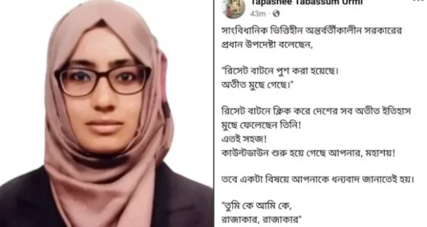 নির্বাহী ম্যাজিস্ট্রেট তাপসী তাবাসসুম উর্মি তার ফেসবুক পোস্টে লেখেন, ‘সাংবিধানিক ভিত্তিহীন অন্তর্বর্তী সরকারের প্রধান উপদেষ্টা বলেছেন, রিসেট বাটনে পুশ করা হয়েছে। অতীত মুছে গেছে। রিসেট বাটনে ক্লিক করে দেশের সব অতীত ইতিহাস মুছে ফেলেছেন তিনি। এতই সহজ! কাউন্টডাউন শুরু হয়ে গেছে আপনার, মহাশয়।’