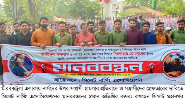 মানবন্ধনে বক্তারা বলেন, গত ২৪ মার্চ রাতে সিলেট নগরের মীরবক্সটুলায় এলাকায় অন্যায়ভাবে নার্সিং কলেজের শিক্ষার্থীদের উপর হামলা করেছে কিশোর গ্যাংয়ের সন্ত্রাসীরা। পরবর্তীতে ওসমানী মেডিকেল কলেজ হাসপাতালেও অতর্কিত হামলা চালায় সন্ত্রাসীরা। হামলাকারীদের আগামী ২৪ ঘণ্টার মধ্যে গ্রেফতার করার জন্য প্রশাসনের নিকট জোর দাবি জানানো হয়। তা না হলে আগামীতে আরও কঠোর কর্মসূচির হুশিয়ারি দেন বক্তারা। নার্সিং কলেজের শিক্ষার্থীদের উপর হামলাকারী কিশোর গ্যাংয়ের সকল সন্ত্রাসীদের গ্রেফতার করে দ্রুত আইনের আওতায় আনার জোর দাবি জানানো হয়।